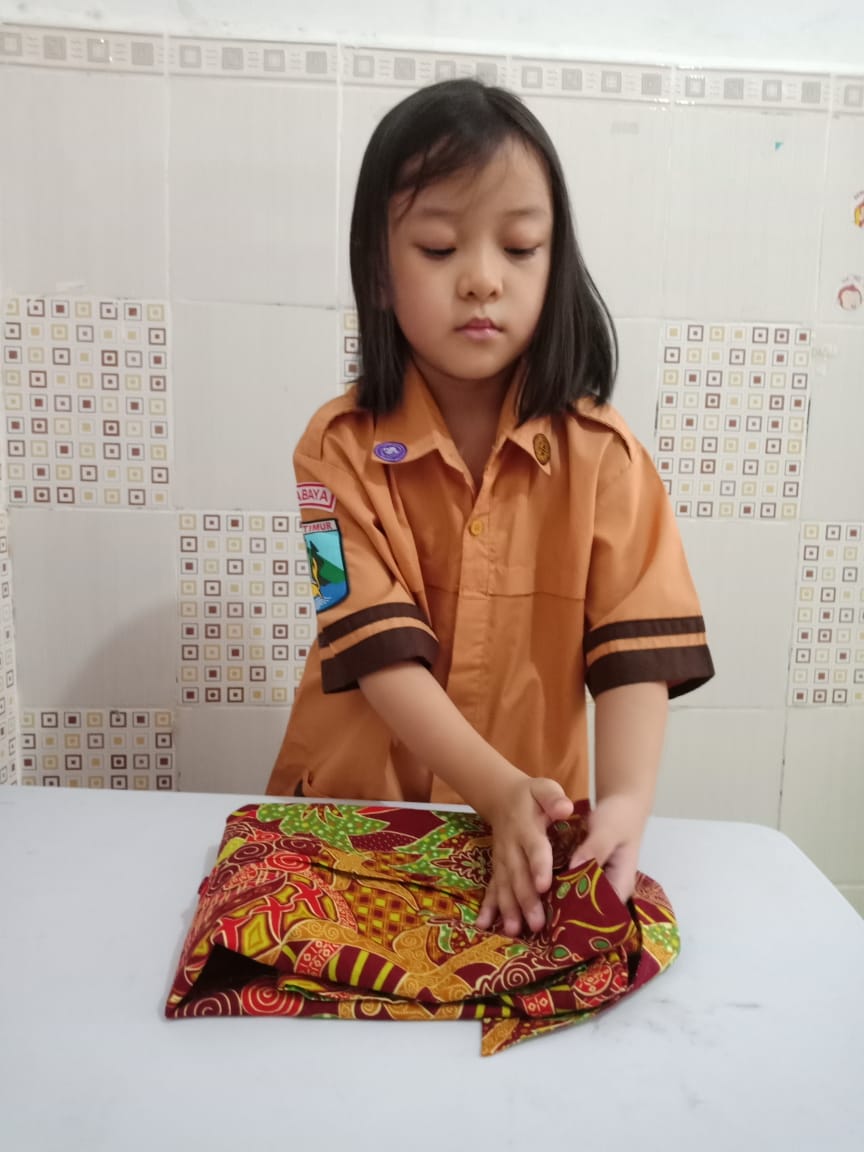 Hari ini, Kamis 7 Oktober 2021, kami belajar membantu orang tua merapikan barang-barang kami. Ibu guru mengajari kami bagaimana cara melipat baju seragam, kemudian kami mempraktikkannya di rumah. Selain itu kami juga belajar merapikan tempat tidur, merapikan meja belajar, menyapu kamar tidur dan juga kami belajar membantu ibu mengangkat jemuran. Semua kegiatan tersebut kami lakukan dengan penuh sukacita, sehingga kami merasa kegiatan tersebut menyenangkan.