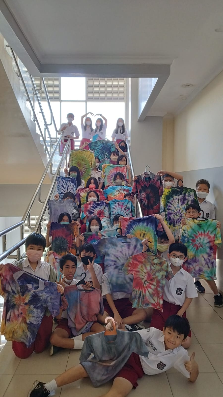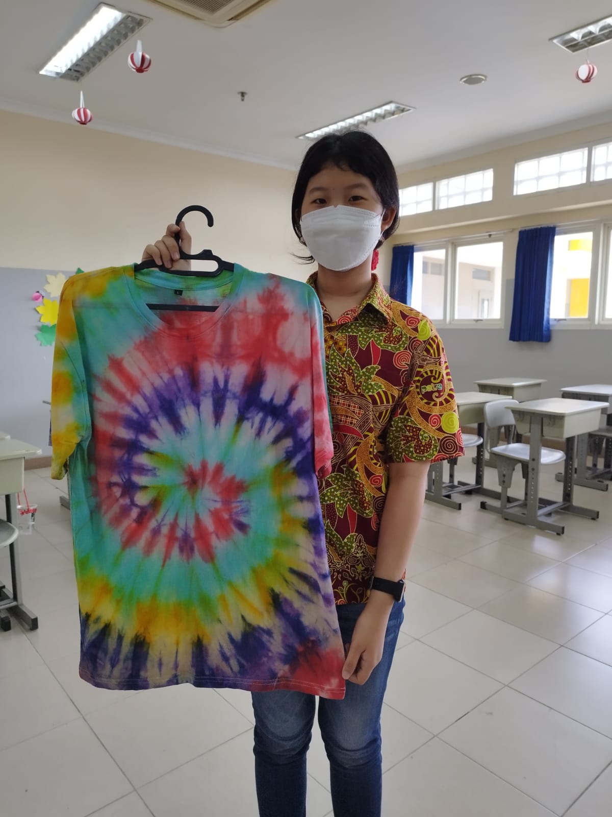 Tibalah saat perpisahan kelas, kamipun mengenakan kaos dengan motif jumputan hasil karya sendiri. Kamipun saling mengomentari hasil karya teman- teman, ada yang bagus tetapi ada pula yang gagal karena kualitas kaosnya kurang bagus. Namun, kami tetap bersenang-senang dan berfoto – foto. Kami bangga dengan hasil karya inovasi buatan masing-masing. Tidak menyangka bahwa batik jumputan tidak hanya bisa digunakan untuk motif pada taplak, tetapi juga bisa pada kaos.Wow keren …. kami sungguh senang.dan bangga. Terima kasih Tuhan atas hikmat yang Kau berikan pada kami. Jangan takut untuk mencoba ya, teman-teman…..