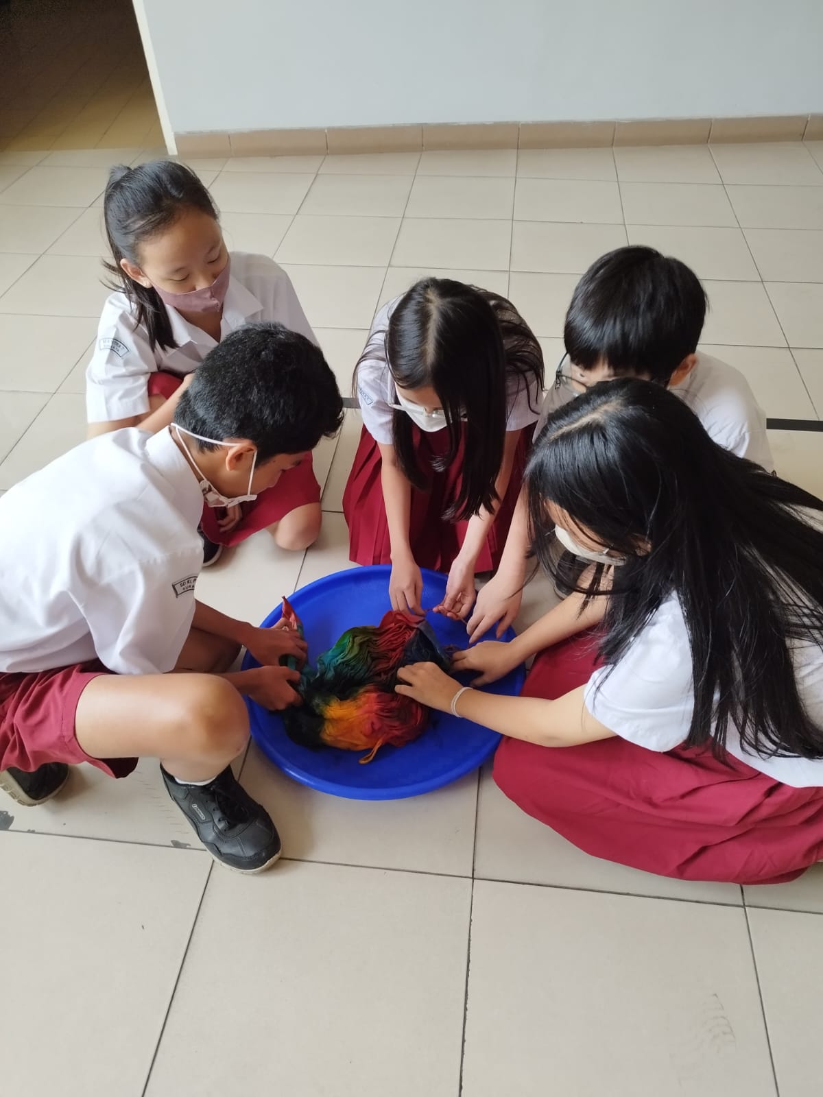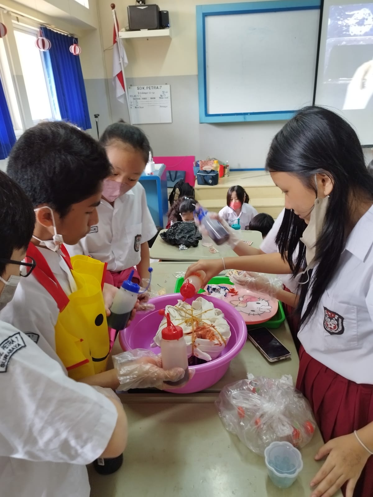 Kami siswa kelas VC SD Kristen Petra 7 pada hari Rabu, 5 April 2023 membuat keterampilan taplak bermotif batik jumputan. Adapun bahan yang digunakan adalah pewarna kain (wantex), garam, dan cuka . Alat yang digunakan adalah kain katun, karet, plastik/kresek, botol plastik bekas yang tutupnya dilubangi/ botol kecap, nyiru / baskom besar.
