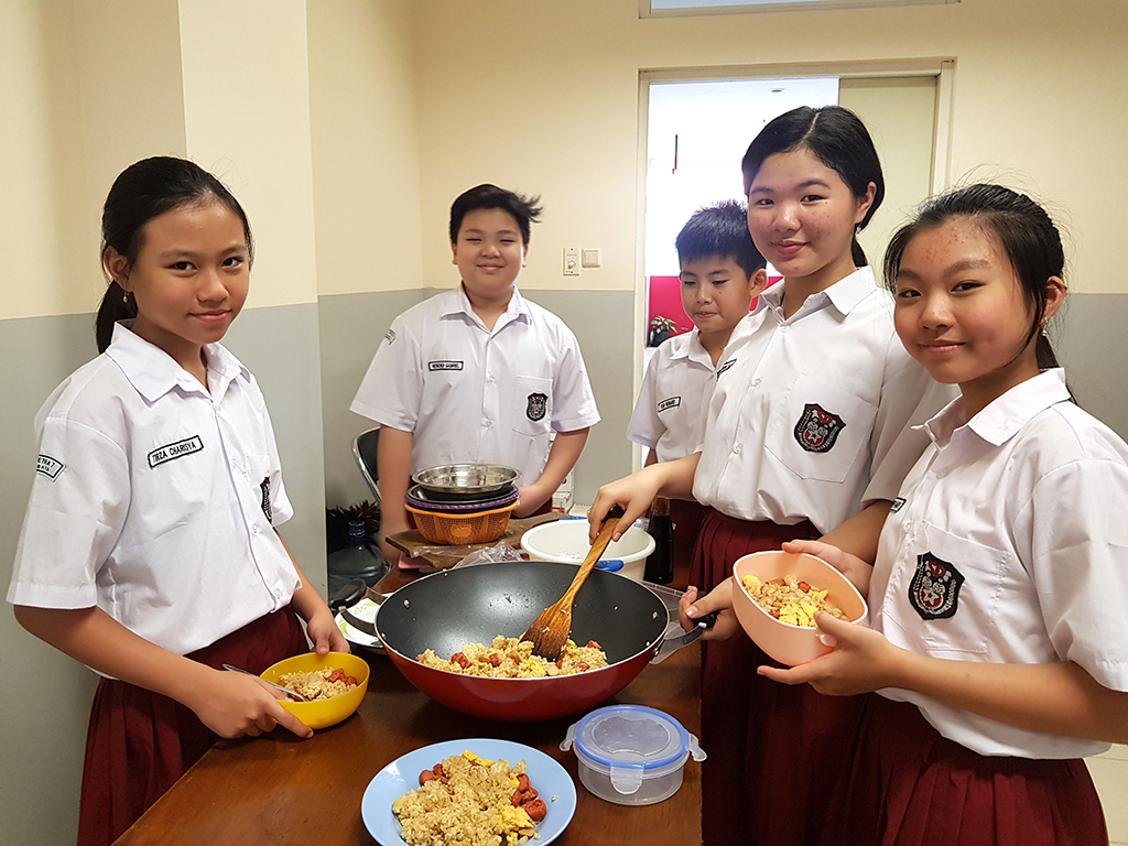 Dalam kegiatan BLS (Basic Life Skills) kali ini, para siswa kelas VI belajar memasak nasi. Para siswa mendengarkan penjelasan dari guru dengan penuh perhatian dan mereka belajar memasak nasi, mengupas bawang, mengocok telur dan membuat nasi goreng. Hmm… nasi goreng lezat sudah siap disantap bersama. Dengan kegiatan ini diharapkan para siswa dapat mandiri dan memasak sendiri ketika orang tua sedang sibuk.