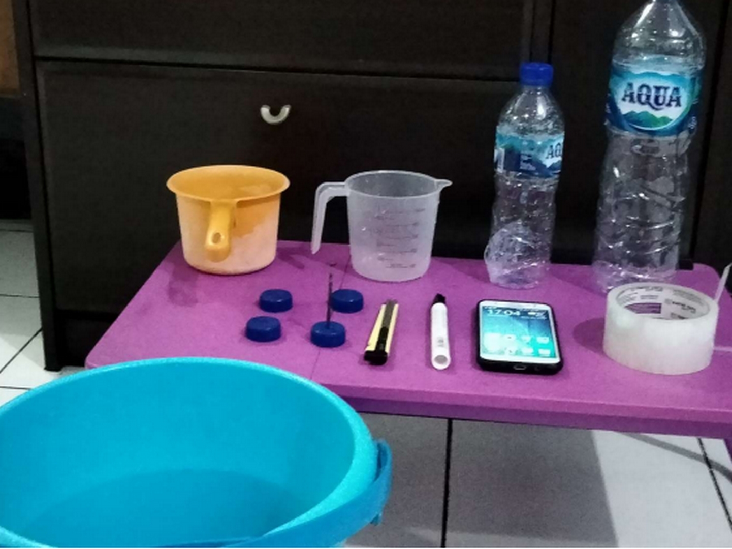 Pertama, kami mempersiapkan botol berukuran 600 ml dan 1500 ml, tutupnya kami beri lubang dengan diameter yang sama untuk tempat mengalirnya air. Ketika kami menuang air 1.500 ml dalam baskom waktu menunjukkan 52,6 detik. Selanjutnya kami menghitung debit air tersebut yaitu 28,5 ml/detik. Sedangkan botol yang berisi 600 ml air dituangkan ke baskom memerlukan waktu 21,14 detik dan setelah dihitung ditemukan debitnya 28,38 ml/detik. Tidak hanya kelompok kami, kelompok yang lain lebih menantang lagi, mereka melakukan percobaan mengisi botol 500 ml dengan 3 tutup yang berbeda yaitu satu lubang, dua lubang dan tiga lubang. Bagaimana ya debitnya? Penasaran kan teman-teman?