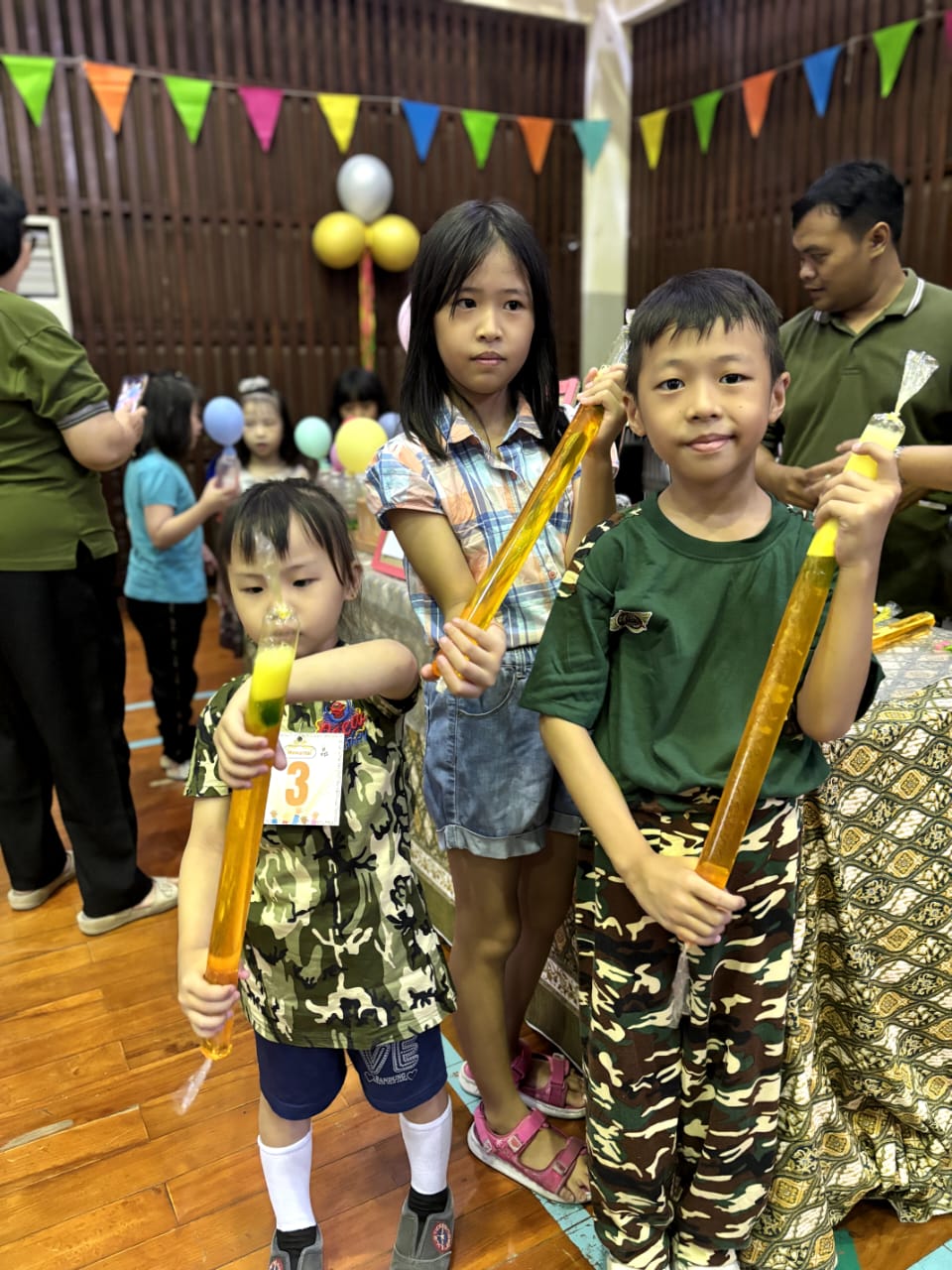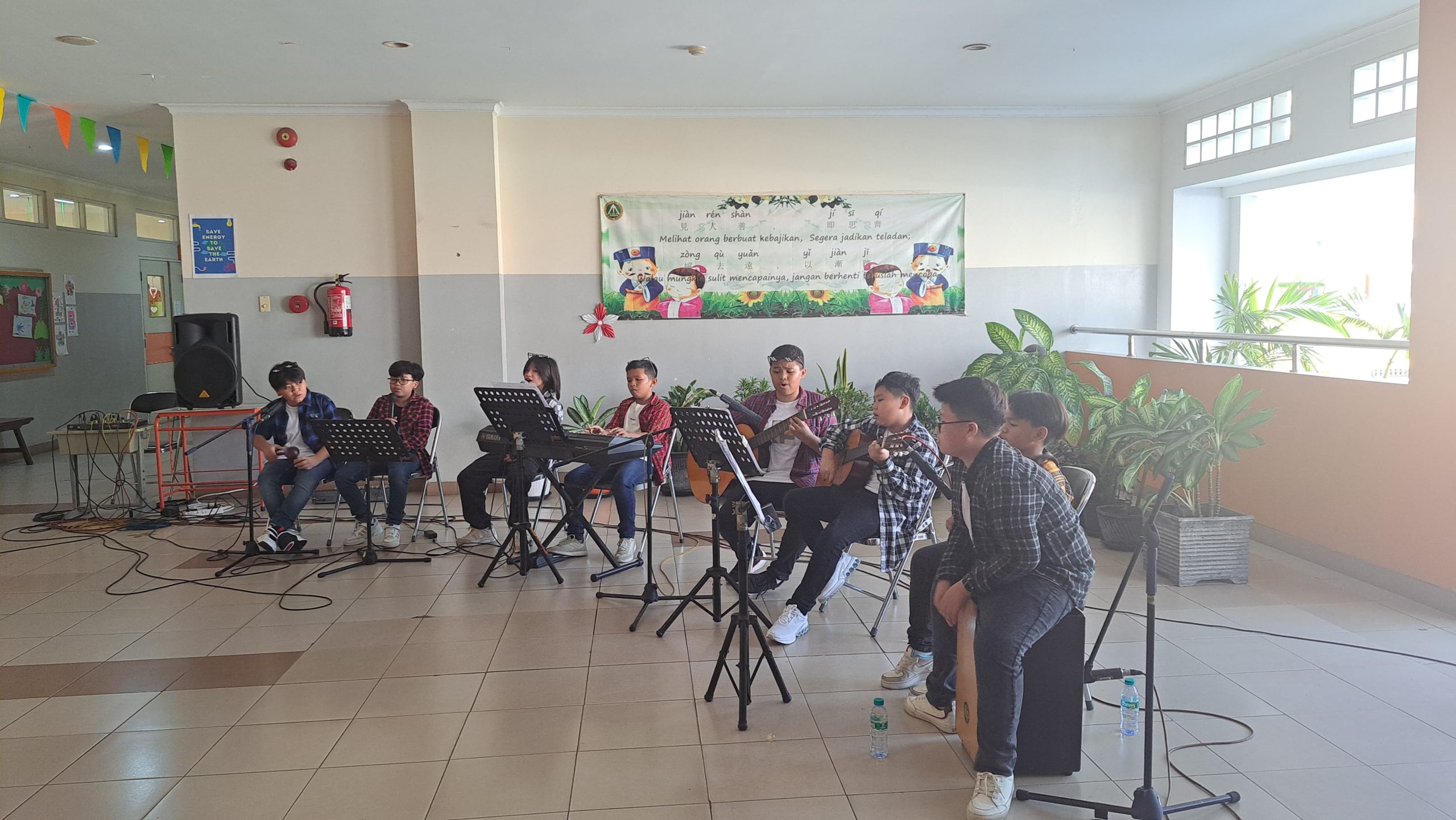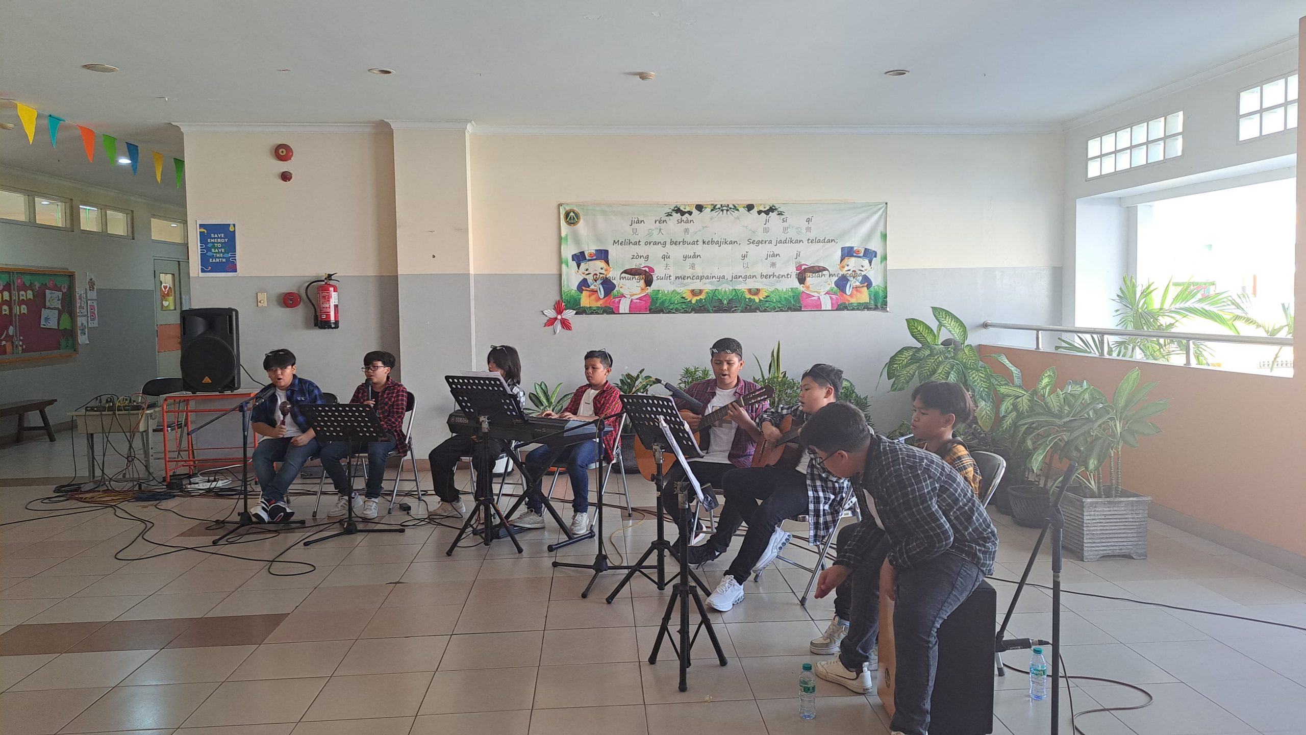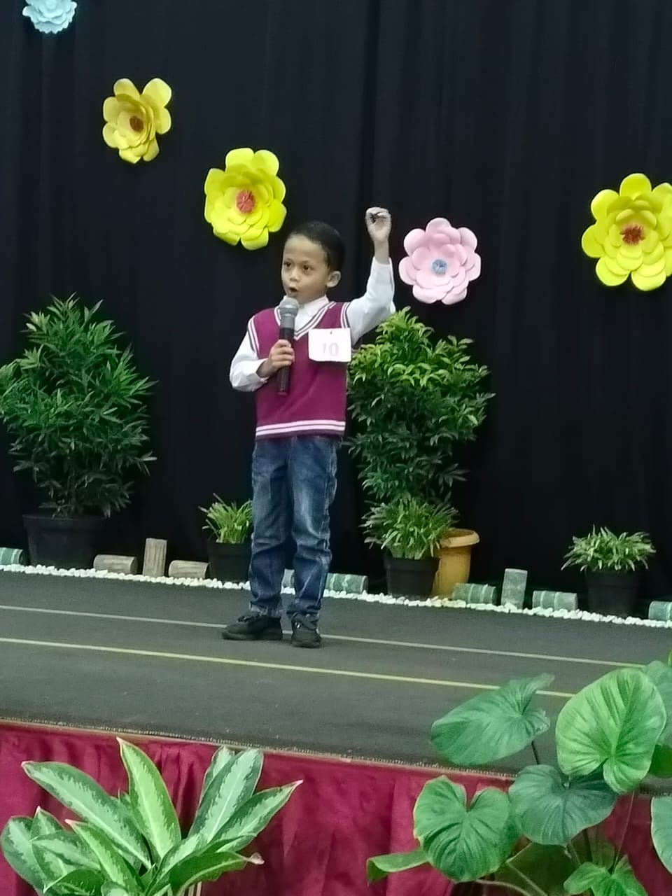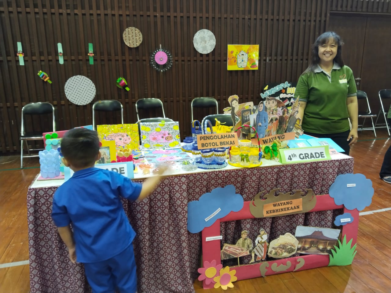 Ada beberapa penampilan seperti menyanyi oleh Bellvania kelas 2C di pannggung dengan judul “Lagu Cinta untuk Mama”, wushu oleh Moses kelas 5B, tari buang sampah oleh siswa kelas 5, drama musikal ajakan makan sayur oleh kelas 6, live music dari beberapa siswa kelas 6. Oh ya… ada lomba-lomba juga loh, yaitu lomba menyanyi, mewarnai, clash of seven yang terdiri dari tiga pos yaitu menyusun menara gelas, memasukkan bola ke dalam keranjang, dan mengumpulkan bentuk geometri. Ketiga pos tersebut melatih ketangkasan. Tak kalah menarik juga ada pameran hasil karya siswa kelas 1-6.