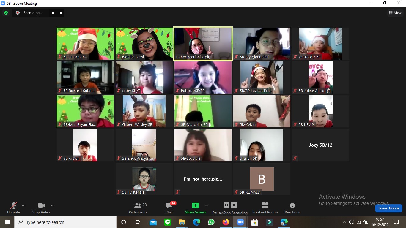 Setelah ibadah Natal selesai, mereka mengikuti kegiatan Virtual Christmas Talent Show Live in ZoomTalent show bertema Natal kali ini dibuat berbeda karena para siswa menampilkan talenta mereka dalam bernyanyi, menari, membaca puisi, dan bermain musik secara live. Para siswa tampil dengan percaya diri dengan kostum serta aksesoris Natal. Mereka memuji Tuhan dengan sukacita. Puji Tuhan. Kegiatan berjalan dengan lancar. Selamat Natal 2020 dan selamat menyongsong Tahun Baru 2021. Immanuel!!